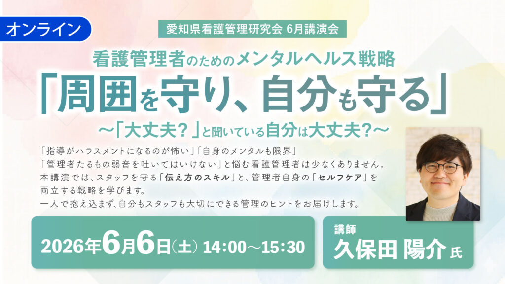 看護管理者のためのメンタルヘルス戦略「周囲を守り、自分も守る」〜「大丈夫?」と聞いている自分は大丈夫?〜 開催日:2026年6月6日(土) 時 間:14:00 ~ 15:30 講 師:久保田 陽介 氏(中村公園メンタルクリニック 院長 精神科医) 開催方法:... -